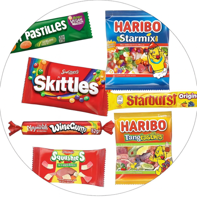 Each bag contains 7 items - Haribo Starmix & Tangfastic, Squashies, Fruit Pastels, Wine gums, skittles & Starbursts (items may change depending on availability)